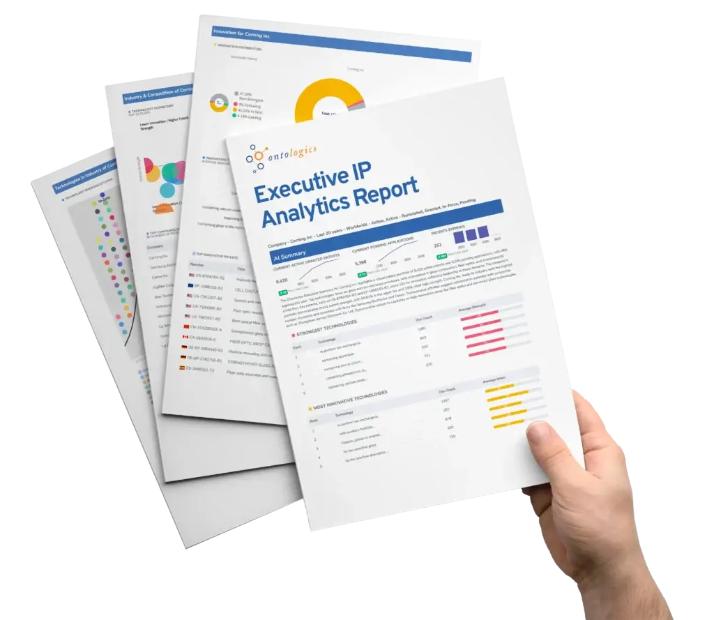 Simply ask our generative AI platform a question and get clear, data-driven answers in seconds. From M&A opportunities to portfolio strength and emerging technologies, Ontologics AI turns complex IP data into actionable insights—helping you move faster, smarter, and with confidence.